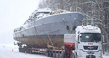 Nurminen Logistics transports former mine sweeper vessel overland in winter Finland