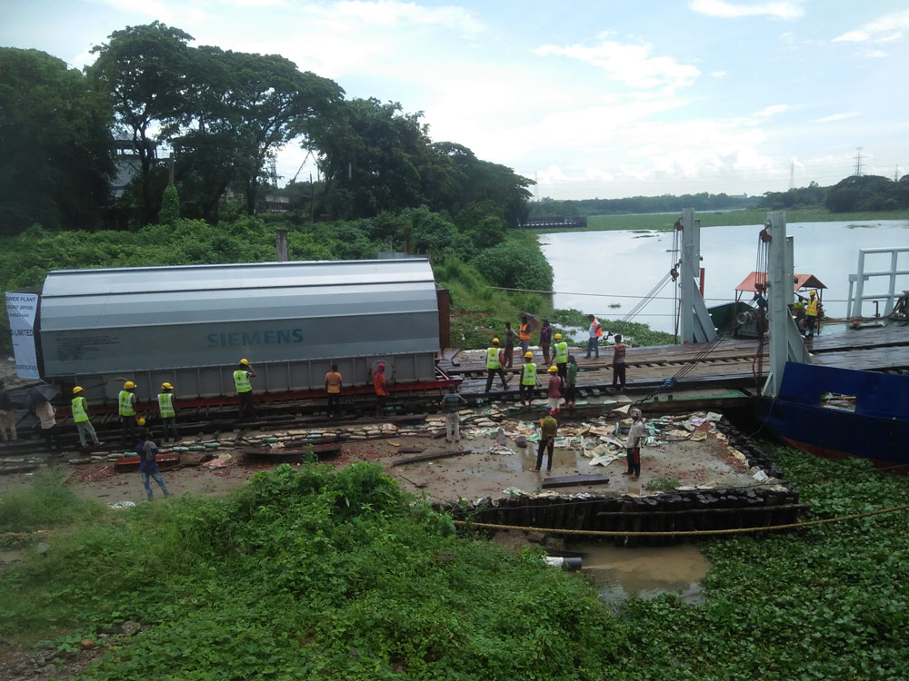 The heavy-lift items, especially the GAS Turbine (GT) weighing 314 Tons and the Gas Turbine Generator (GTG) weighing 328 Tons, were received from ocean vessels at Mongla Port, loaded onto flat barges and transported on the river from Mongla to Ghorasal. After discharge from the barges these items got diverted to the project site by manual skidding.