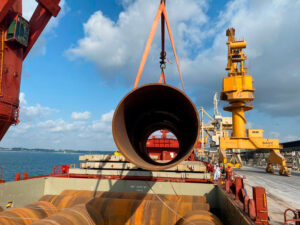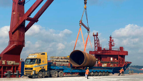 Express Global Logistics (EXG), member to the Worldwide Project Consortium (WWPC) in India, successfully executed the breakbulk movement of 72 large pipes, with a combined weight of 3,400 metric tons and a total freight volume (FRT) of 6,100 cubic meters from Southeast Asia to Bangladesh. This impressive project involved meticulous planning and execution, divided into two strategic lots to ensure safe, efficient handling and delivery of the cargo.