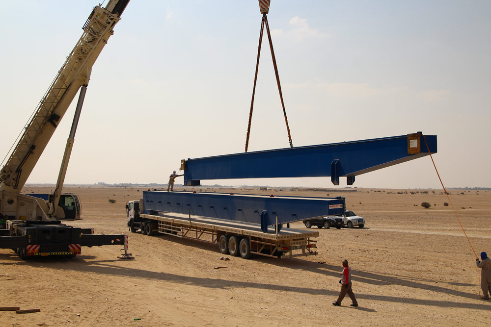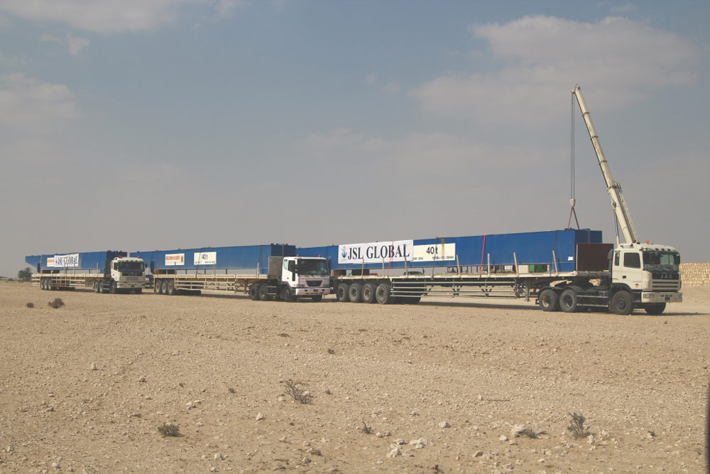 There were a total of eight 27 meter long pieces which required special long trailers. JSL had to arrange such special trailer and arrange for police escort and route survey ex their client site to Hamad Port.