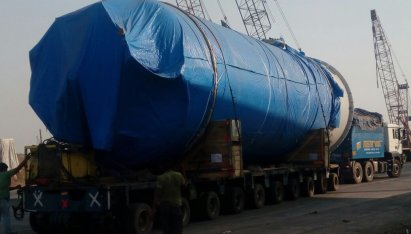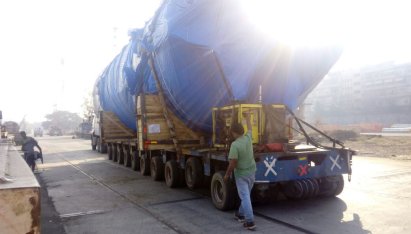 The distance for this project delivery covered 530 km and started in Chakkan with six intermediate stations until final delivery point being Mumbai. The two large HP Heaters had single dimensions of 14.4 x 4.7 x 5.6 m with a weight of 41.4 tons each. EXG engaged 10 and 8 hydraulic axles and 2 prime movers for this operation.