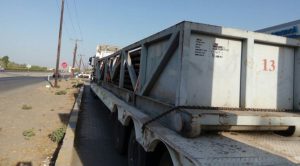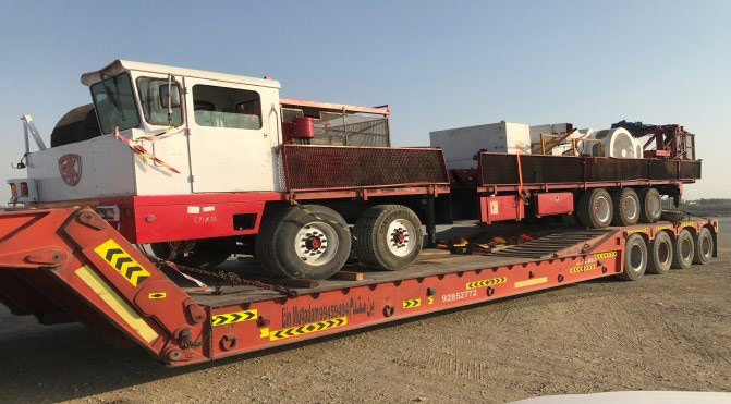 Three numbers of 100 ton low bed – carrying the rig carrier and the two pipe boxes, one 18 m long flat bed – carrying the rig mast and six numbers of 12 m long (and 3 m wide) flat beds were used to transport the components to Nizwa. The dispatch from port and the offloading operations at site were handled with 100 ton cranes. The in gauge components were carried in 12 meter flat beds. A total tally of 13 trailers, were used in the whole project. Traversing the distance of 350 kilometers, through the city limits of Sohar, Muscat and Nizwa was the main challenge in the job. Inspite of all odds, the whole operation was completed within a span of just two days from customs clearance.