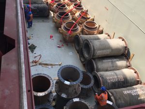 Most of the reclamation equipment was loaded from Van Oord’s own quay in Ras Al Khaimah Maritime City. Within less than a week, 4,500 tonnes of pipes, hoses, couplings, pipe pontoons and buoys were loaded on board. Steder Group coordinated the loading operation 24-hours per day in order to meet the tight project schedule and to dispatch the cargo on time.