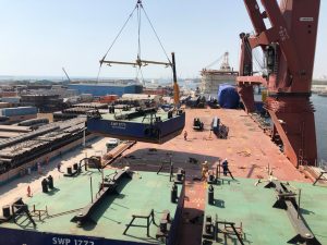 For this complex operation, Steder Group chartered Zeamarine’s Industrial Fusion which arrived in Van Oord’s Yard in Ras Al Khaimah to discharge the 4,000 cubic meters / 1000 tonnes of cargo returning from the project in Nigeria, after which 17,500 cubic meters (6,000 tonnes) of cargo was mobilized for their project in Dos Bocas.