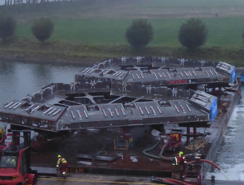 On behalf of a renowned Belgium Offshore Marine Engineering Co., both Steder Group and Mammoet companies joined forces to move four spudcan shoes, each 220 ton in weight, from the supplier premises via the Dutch inner waterways to a ship yard in the Rotterdam area, for installing the shoes onto a jack up vessel.